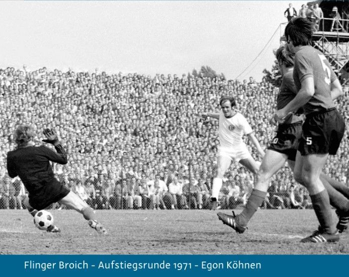 Nach der ersten Bundesliga-Saison 1966/67 spielt Fortuna damals in der zweitklassigen Regionalliga West und wird 1970/71 in der neuen alten Umgebung Vizemeister. Man erreicht damit die Aufstiegsrunde zur Bundesliga. 25.000 Zuschauer im pickepacke vollen Stadion bestaunen den Führungstreffer von Egon Köhnen gegen den großen Favoriten 1.FC Nürnberg und am Ende steht Fortunas zweiter Bundesliga Aufstieg fest. Im alten Spielertunnel, der heute noch an der Nordwestecke des Stadions existiert, steht es damals in großen Lettern an die Wand gemalt: „Egon Köhnen muss nicht föhnen“. Auch im Pokal erlebt das Stadion in der abgelaufenen Saison Glanzstunden. Borussia Mönchengladbach wird 3:1 abgefertigt und im Halbfinale verliert Fortuna nach guter Leistung knapp gegen den FC Bayern mit 0:1. Sepp Maier verhindert somit eine weitere Sensation.